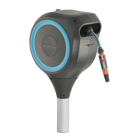 Phía sau bộ dây có tích hợp một đầu chờ. Để khi di chuyển cuộn ống dây bạn có thể cắm cút nối đường cấp nước vào tránh tràn nước ra ngoài. Trên giá treo tường có hai khe hở để treo vòi phun. Trong trường hợp bạn cần sử dụng thêm các loại vòi phun nhiều chức năng khác của Gardena.