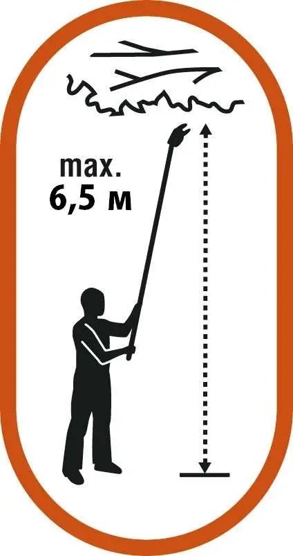 Cán cầm có chiều dài thay đổi từ 230 đến 410 cm giúp dễ dàng và an toàn để cắt và loại bỏ các cành cây ở độ cao lên tới 6,5 mét so với mặt đất nếu tính thêm chiều cao của người dùng.