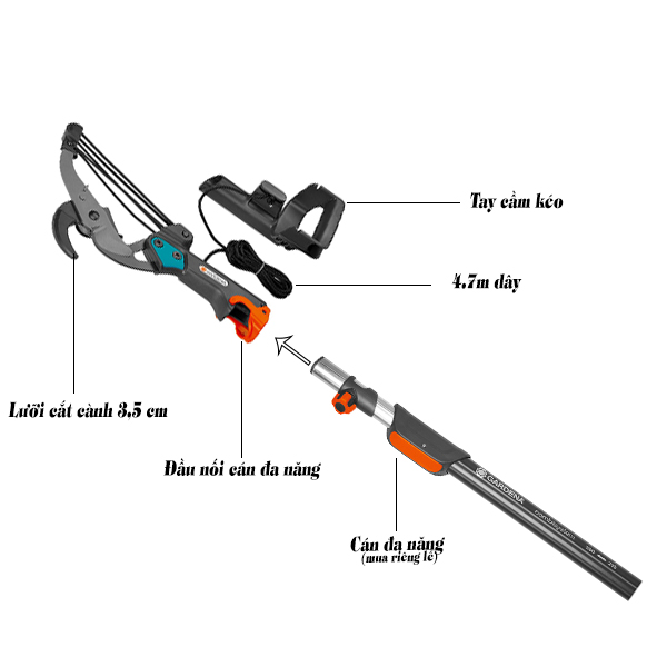 - Chuôi cán cưa có thể nối ghép cán đa năng thay đổi chiều dài (03721-20 và 03720-20) để cắt các cành cây trên cao.