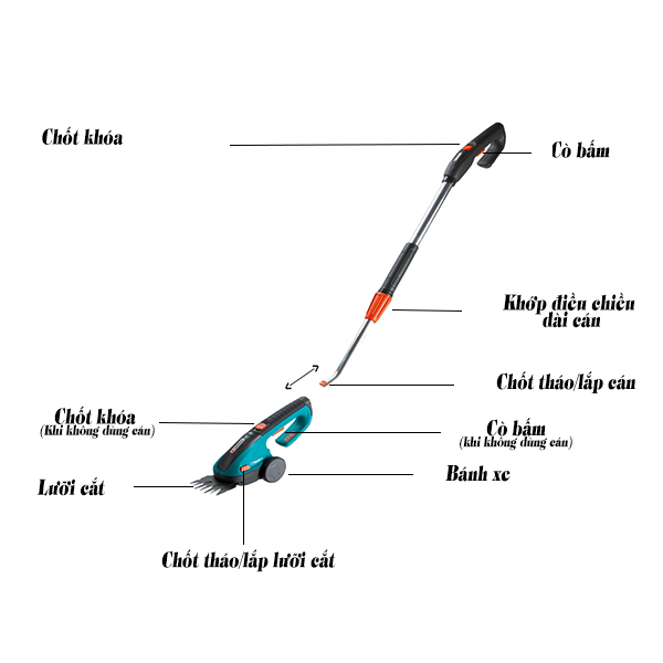 - Máy cắt cỏ cầm tay gồm có 1 pin sạc, 1 lưỡi kèm theo máy, 1 cán nối dài 85-120 cm